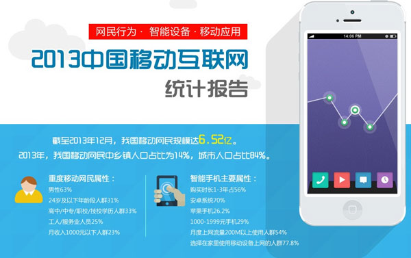 易观智库发布《2013中国移动互联网统计报告》。报告显示,截止2013年12月,中国移动互联网网民达到6.52亿,伴随着移动终端价格的下降及wifi的广泛铺设,移动网民呈现爆发趋势。12月底工信部发布4G牌照,运营商希望借势4G重新定义行业竞争局势,势必继续带动移动网民的进一步快速增长。
